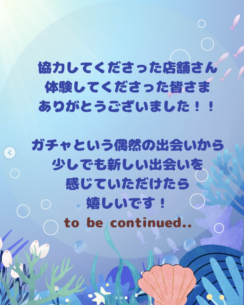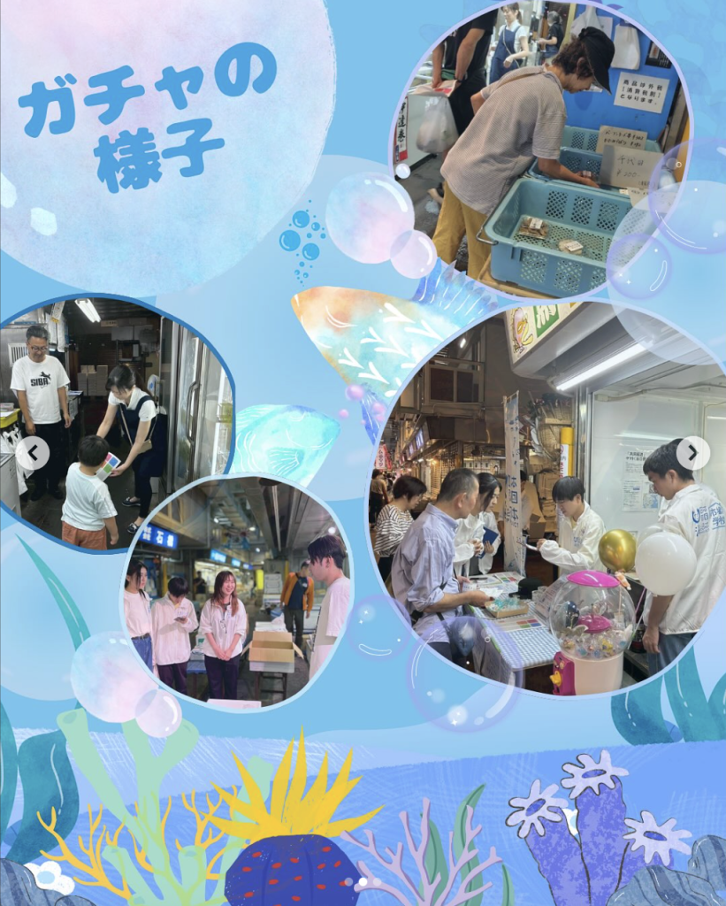 今回は、特別に市場の一角をお借りして「おためし魚ガチャ」の実施が叶い、実際にお客様に体験してもうことができました。ガチャの商品を協力してくれた4店舗の方に相談しながら決め、チラシやガチャ玉の中に入れる紙を作り、お客様にどうやって説明するかを確認して、いざ本番! お客様が来てくれるか不安でしたが、呼び込みなどアピールを頑張り、無事予定数を売り切ることができました。